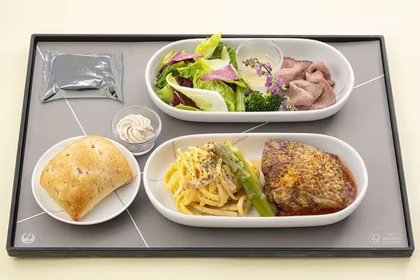 東京(羽田)-大阪(伊丹)・札幌(新千歳)・福岡・沖縄(那覇)10:30~16:59の出発便の昼食(搭乗日2026年3月21日~31日)ローストビーフのサラダ仕立て、彩野菜 ヴィネグレット、スパイスローストチキン トマトソース、クリーミーパスタ、プチパン、桜バター、天空の抹茶クリームサンド、栄光堂製菓