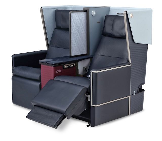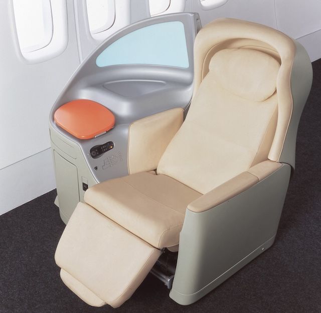 2001年~ファーストクラスで採用された電動のフルフラットシート「スカイスリーパーソロ」。ボーイングB777-300ER、B747-400など"