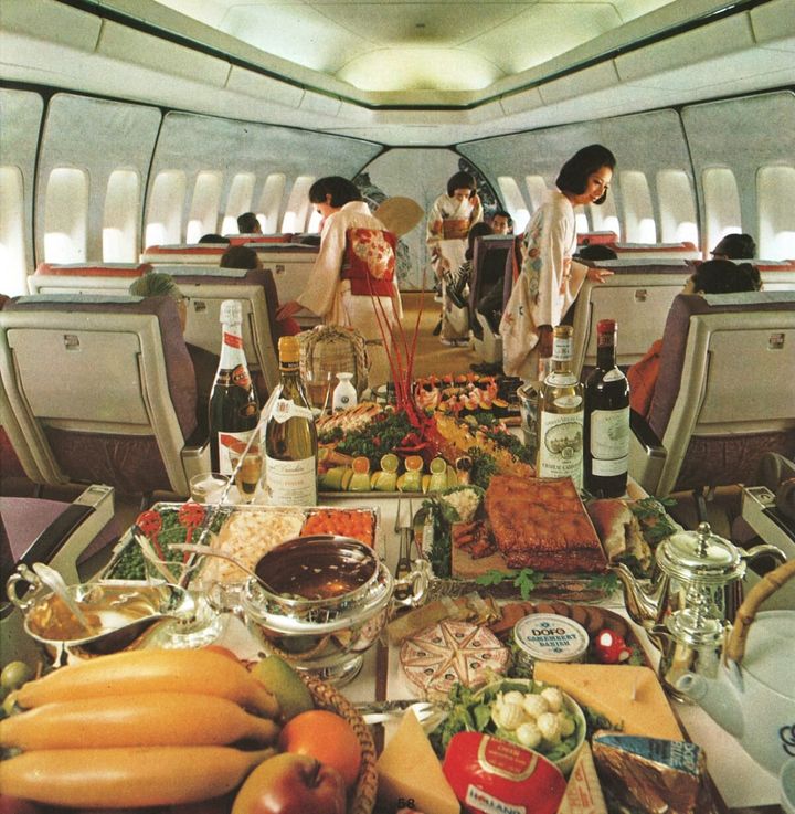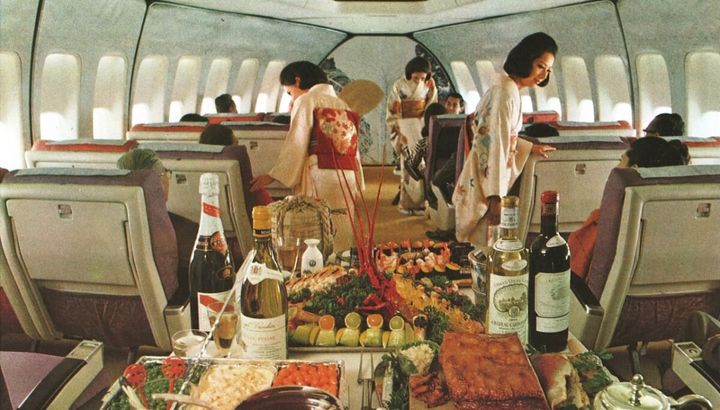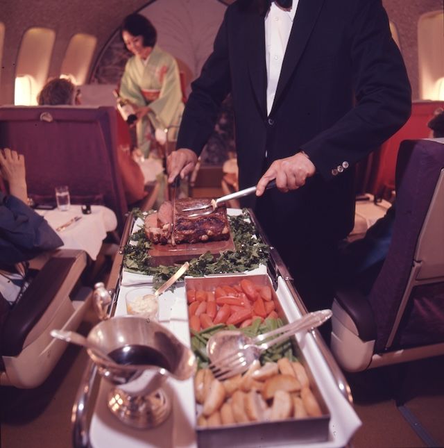 機内食はフルコース料理。伊勢海老、チーズ・ローストビーフ・ホールケーキ・フルーツなどを切り分ける、ソムリエがワインを提供するなどの豪華なサービスが目を惹きます。現在のファーストクラス担当CAは3人ほどですが(機材にもよる)、当時は倍以上配置されていたそうです。