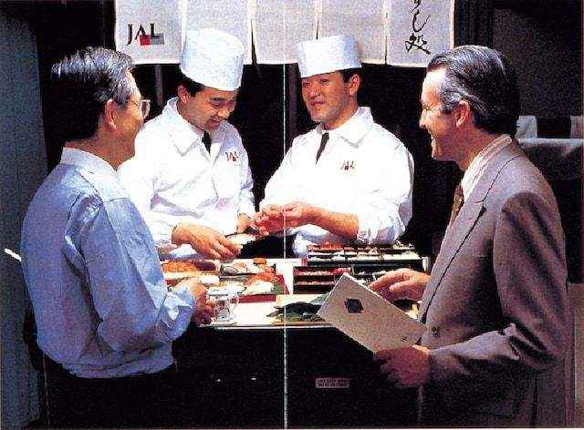 1991年3月30日には、ファーストクラス・エグゼクティブクラスのサービスとして「寿司バー」が登場します。機内にいながら好きなタイミングで好きなネタを握ってもらえるというサービスは大評判。成田-ワシントン線就航記念として、3カ月のみ実施でしたが、話題となりました。