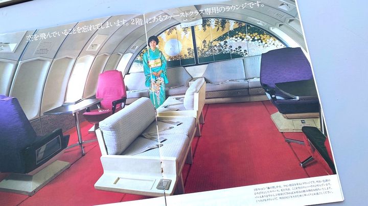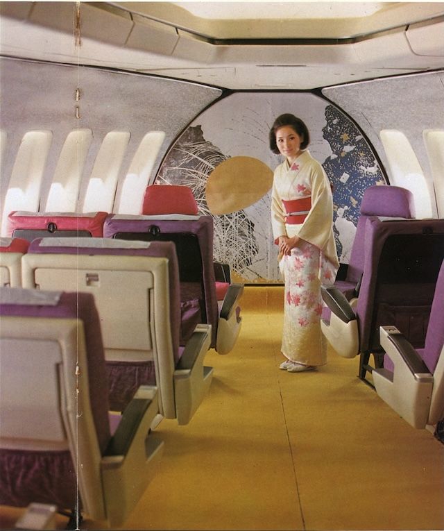ファーストクラスは1階・2階とも加山又造画伯の壁画(キャビンは「銀河の図」、ラウンジは「日輪草花図」)。エコノミークラスの壁面には日本の四季を代表する草木の絵が鮮やかに描かれていました。外国人客からは「京都が空を飛んでいる」と大変評判だったそうです。
