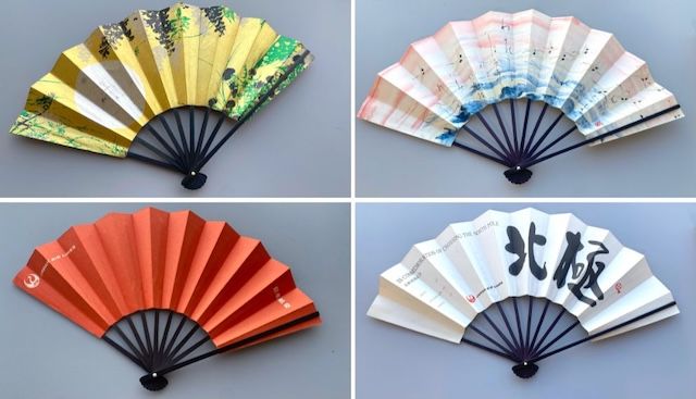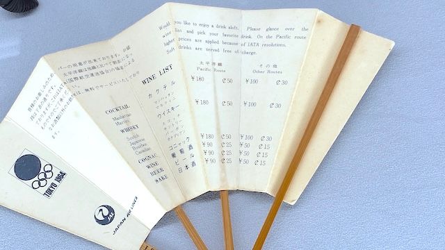 当時は日本文化をより知ってもらうために、様々なノベルティがありました。特に扇子はデザインも多様で、裏は北極や赤道の通過記念証になっているものや、ドリンクメニューになっているものも。