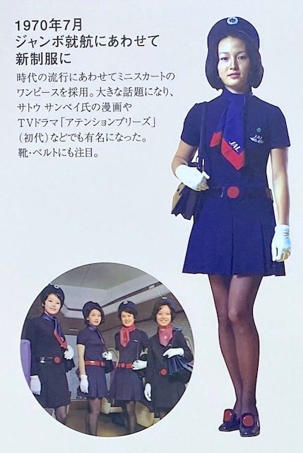制服は流行にあわせて採用されたミニスカートが大きな話題になる。TVドラマ「アテンションプリーズ」(初代)などでも有名に(JALテクニカルセンター展示より)