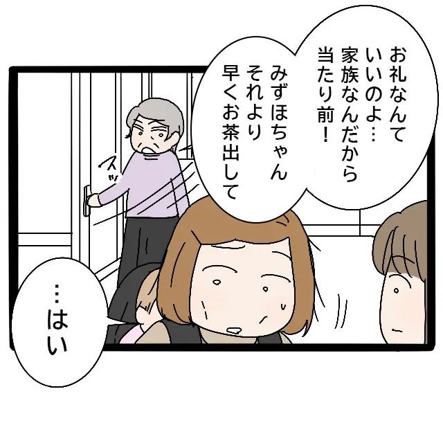 すると、「お礼なんていいのよ・・家族なんだから当たり前!みずほちゃん、それより早くお茶出して」母に素っ気なくそう言われ、「・・はい」と先輩が静かに返事をする様子を見つめていました。