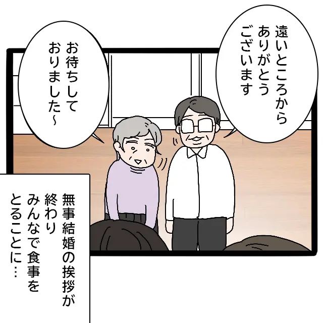 「遠いところからありがとうございます」「お待ちしてました~」父と母にあたたかく迎えられ、結婚の挨拶は無事終了。その後、みんなで食事することになりました。