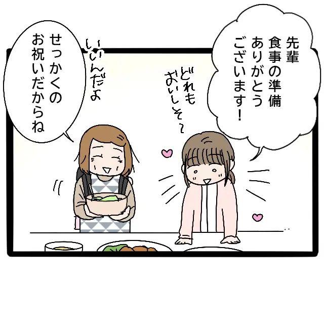 今日のためにと先輩がたくさん作ってくれた料理はどれも美味しそう!「先輩、食事の準備ありがとうございます!」先輩にお礼を言うと、「いいんだよ。せっかくのお祝いだからね」と疲れ切った様子ながら笑顔でそう言ってくれました。