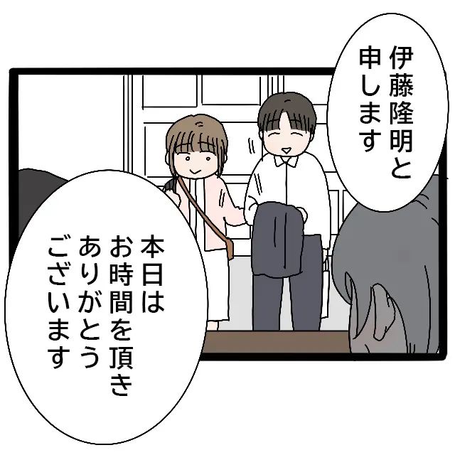 「伊藤隆明と申します。本日はお時間をいただきありがとうございます」隆明が実家にやって来て父と母に挨拶しました。