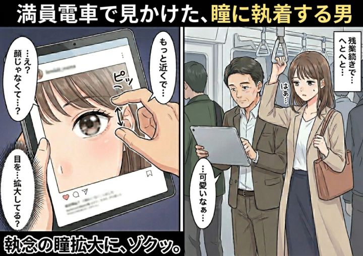 画面いっぱいに広がったのは、彼女の顔全体ではありませんでした。おじさんは、彼女の左目に焦点を当て、画質が粗くなるギリギリまで「瞳」の部分だけをぐんぐんと拡大していったのです。その異常な光景に、私は寒気がしました。ネットの噂で聞いた「瞳に映り込んだ景色から居場所や同席者を特定する」というストーカーの手口を思い出し、隣でそれを行っている人物がいることに恐怖を感じずにはいられませんでした。