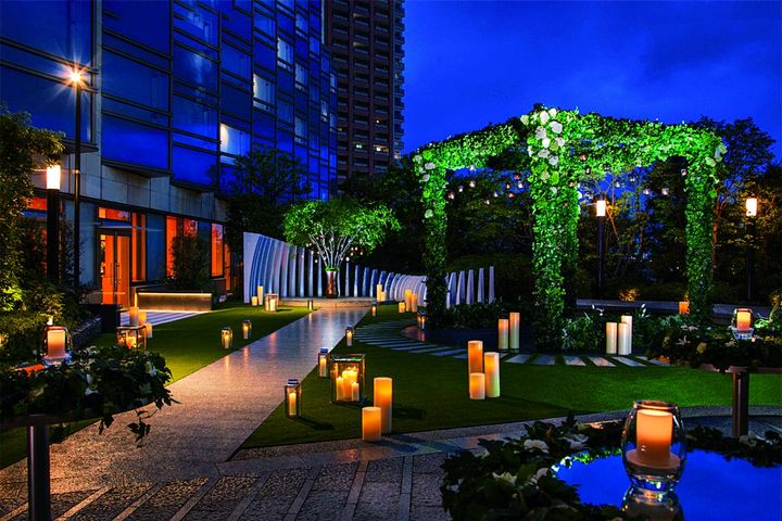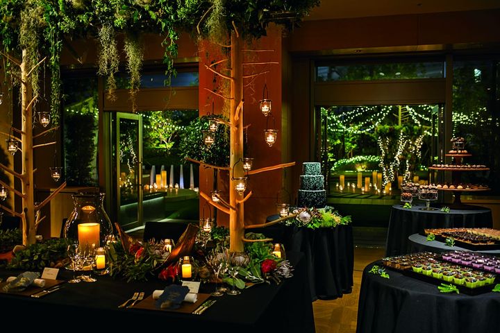 「グランド ハイアット 東京」にある8つの会場のなかで、ユニークなプランニングができると評判なのが、夕方から夜にかけてのパーティのために設計された「タイム」。ショーキッチンが併設された会場の外にはチャペルガーデンが広がります。美しい夜のテラスガーデンを活用しながら、ふたりらしいパーティ演出を。