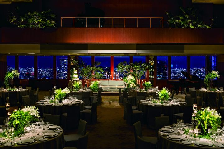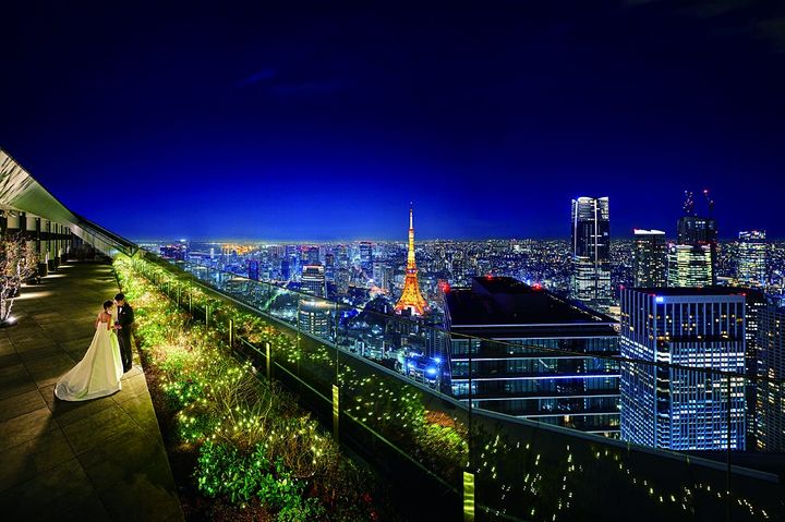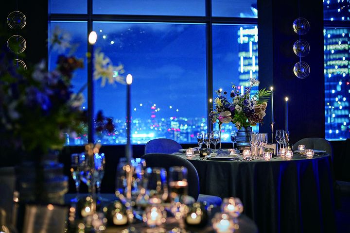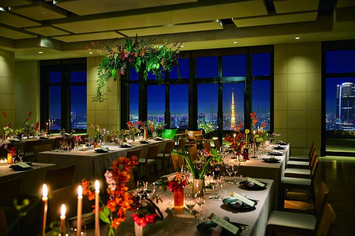 「虎ノ門ヒルズ 森タワー」の上層階に構える「アンダーズ 東京」。最上階の「ルーフトップ スタジオ」は地上約250mの高さにあり、会場の窓からはもちろん、併設のオープンテラスからも東京タワーがアイコニックに輝きます。テラスからの入場やテラスでのデザートビュッフェも可能なので、演出や使い方にアイデアを凝らして。