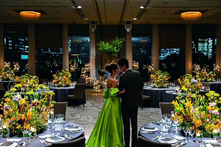 皇居外苑の緑から丸の内エリアの夜景へと、時間とともに表情を変える景色が最高に美しい「パレスホテル東京」。バンケットルーム「山吹」での日曜日夕方からの披露宴は、併設のテラスやホワイエも一緒に借り切ることができ、楽団による生演奏も手配可能。ふたりとゲストのためだけのプライベートな空間を演出できます。