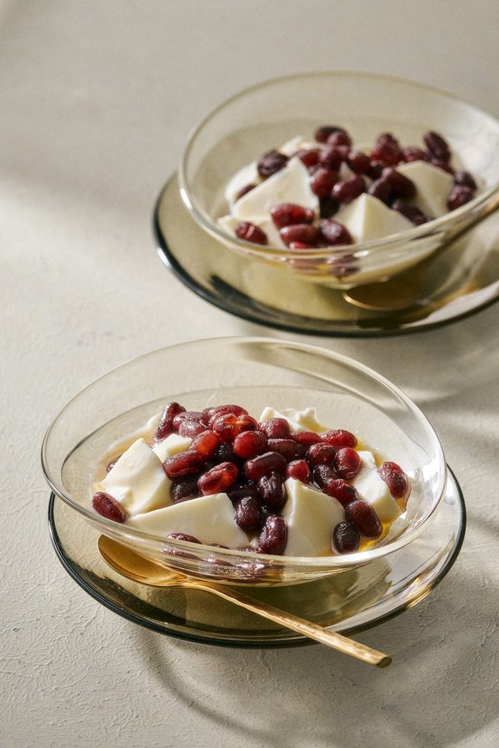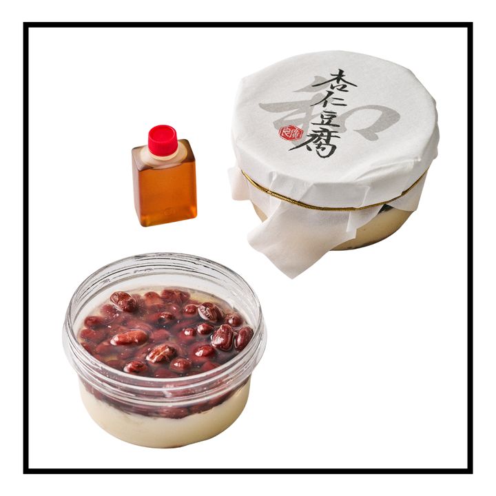ベースとなる杏仁豆腐には、コクとほのかな苦みをもつ北杏(ほっきょう)と、甘みと華やかな香りの南杏(なんきょう)の杏仁の種を使用。そこに岐阜・山岡の糸寒天と生クリーム、牛乳を合わせ、なめらかで香り豊かな口当たりに仕上げている。小豆には京都の丹波大納言を使用。丁寧に炊き上げた小豆はふっくらとやわらかく、一粒一粒の存在感が際立つ。糖蜜には徳島の阿波和三盆を用い、さらりと軽やかな甘みが全体をまとめる。それぞれの素材が持つおいしさを大切にしながら、杏仁豆腐と小豆、糖蜜が織りなすハーモニーを堪能したい。