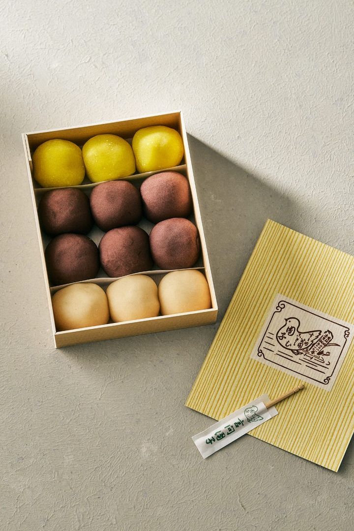 ころんときれいに成形された3種の団子は、職人がふわりとした食感を引き出すため、力加減を大切にし、ひとつずつ丁寧に丸めている。黒と白の団子には、国産米粉を使った餅を、黒あん、白あんで包んだもの。あんこには北海道・十勝のふじむらさき小豆と手亡豆(てぼうまめ)を使用し、あっさりとした甘みとなめらかな口当たりが心地良い。黄色の団子は、青梅をイメージ。白あんに、京都の白味噌と新潟の赤味噌を合わせた味噌あんを用い、葛粉と白玉粉を合わせた求肥で包み、クチナシで色付けして蒸し上げている。ほんのりとした塩気とコクが広がる。素朴で奥深い江戸の味わいは、手土産として会話も弾ませてくれそうだ。