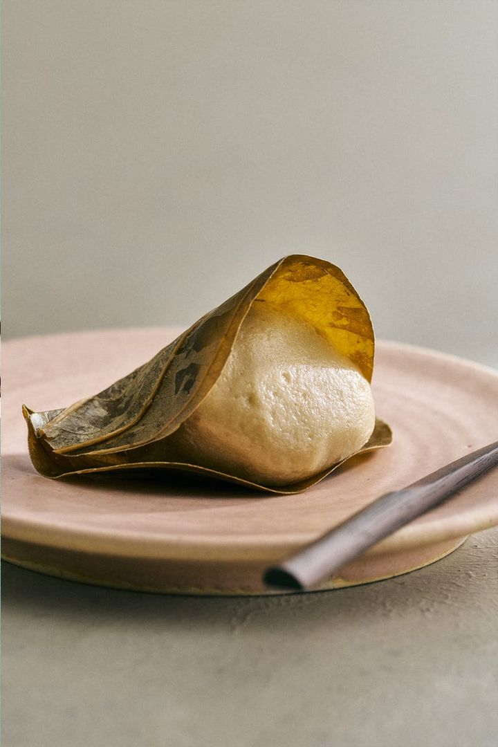あんこには、国産小豆を使用。砂糖を加熱して蜜にしてから炊き上げる製法で仕上げており、なめらかで舌触りのよい食感を生み出している。生麩の生地は、もちっとした食感を引き出すため、職人が季節ごとに配合や水分量を細かく調整している。もっちりとした歯ごたえでありながら、すっとほどけるやさしい口当たりと、こしあんの上品な甘みが絶妙に調和。さらに山帰来の葉のほのかな塩気がアクセントとなり、後味はさっぱりと軽やか。