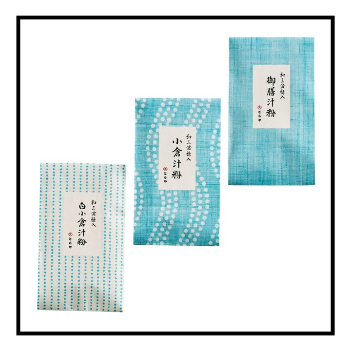 「和三盆糖入りの上品な甘さのお汁粉。こしあんの「御膳汁粉」と、粒あんの「小倉汁粉」、希少な白小豆を使った「白小倉汁粉」の3種があり、店頭では好みのものを詰め合わせできる。4月中旬~8月下旬は夏仕様に切り替わり、冬はお餅入り、夏は扇形の麩焼き入りに。パッケージもブルーを基調としたものに変わり、涼しげでおしゃれ。日持ちも長く、好きなタイミングで楽しめるのもうれしい」と平岩さん。