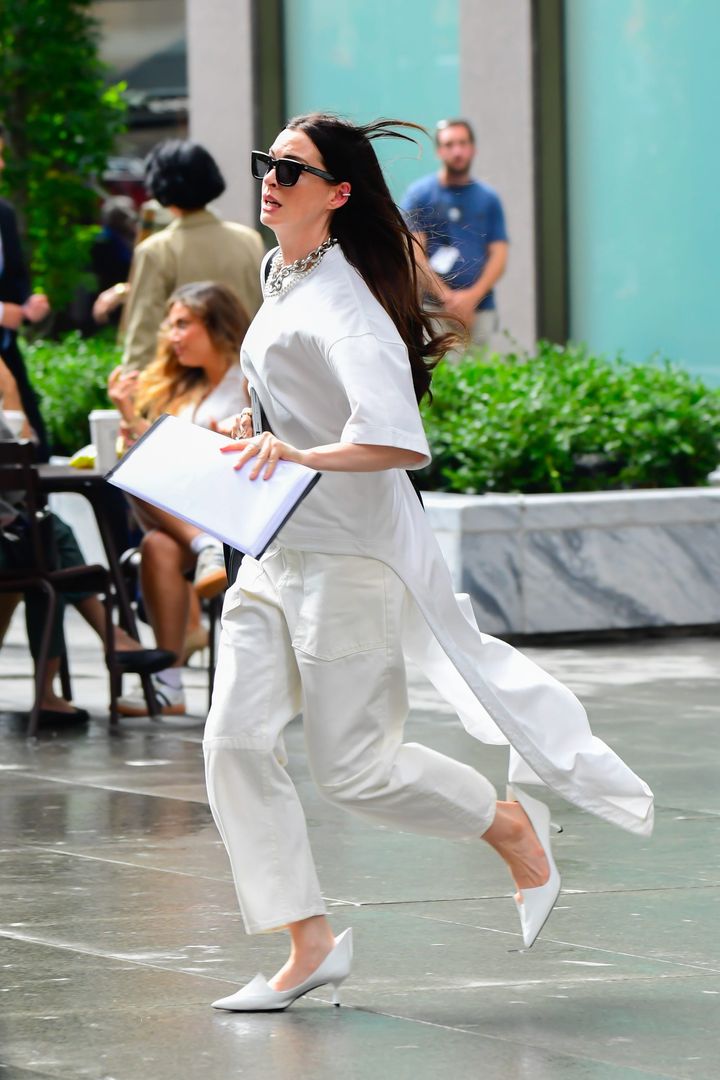 シモーヌ同様、役柄は明らかではないものの、撮影現場でキャッチされたポーリーン・シャラメ。ホワイトデニムのスリットスカートにブルーグリーンのシャツ、ベルトでウエストマークして、デニムルックとはいえエレガントで上品な表情に。メゾン マルジェラの“タビ”ブーツを合わせるあたりも、おしゃれ上級者な役の予感。