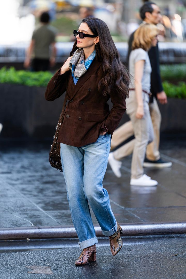 カジュアルなライトブルーのデニムは、ラルフローレンのスエードジャケットを合わせて大人っぽくシックな雰囲気に。スエードのフリンジバッグやスネーク柄のブーツなど、BOHOシックな小物でおしゃれ指数をアップ。