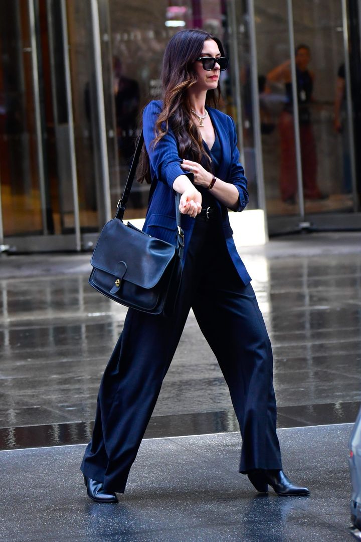 お仕事ファッションに欠かせないネイビーパンツ。アンディはネイビーブルーのピンストライプ柄ジャケットを合わせてかっちりと着こなしつつ、Vネックシャツやコーチのショルダーバッグで抜け感を調整。きちんと感とこなれ感を両立したお仕事コーデがアンディらしい!