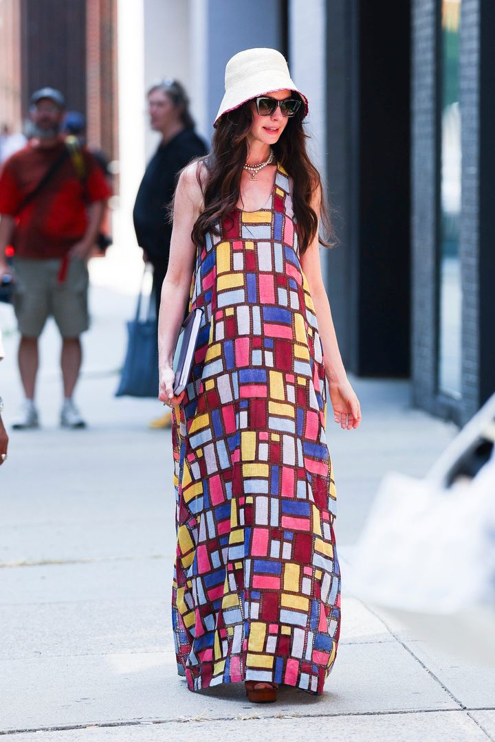 ベーシックカラーが多めのアンディながら、こんなカラフルなアイテムを着こなす姿も目撃。カラーブロックドレスはガブリエラ・ハーストのもの。バケットハットをプラスして、アンディらしいナチュラルさと日焼け対策を両立。