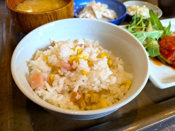 ベーコンととうもろこしの炊き込みご飯は、ふっくら炊き立て、とうもろこしがジュワっと、ベーコンからいい味がでてる~。
