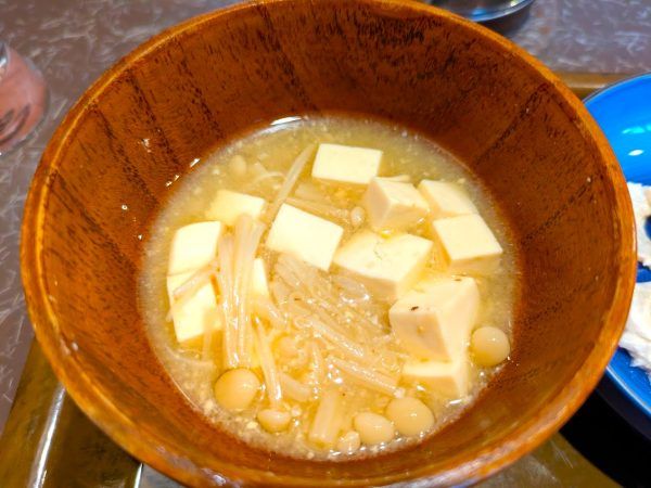 ホッとするようなお味噌汁を飲むと、お豆腐とエノキ茸がたっぷりと入っていました。ヘルシーですね。