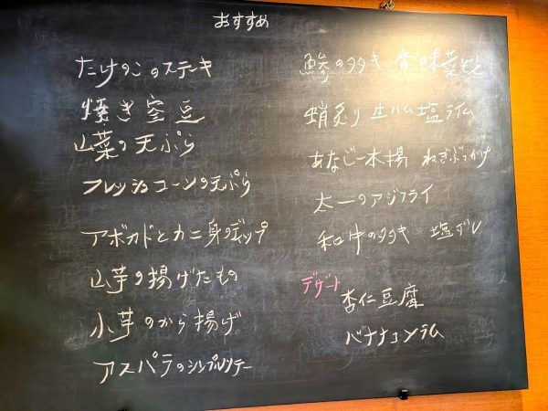 おすすめの料理が書いてあります。たけのこのステーキ・あなごの一本揚ねぎぶっかけ・アボカドとカニ身のディップなど、おいしそうです。
