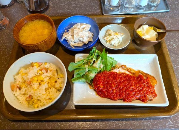 本日の日替わりランチ 1000円 本日の日替わりランチは、ベーコンととうもろこしの炊き込みご飯・ポークチャップ自家製トマトソース・蓮根ツナマヨ和え・味噌汁・漬物・ミニ杏仁付きです。