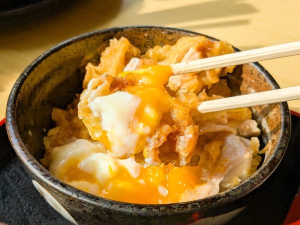 かしわ天丼は、サクサクで揚げたて♪ 甘辛いたれと半熟の玉子をからめていただきます。