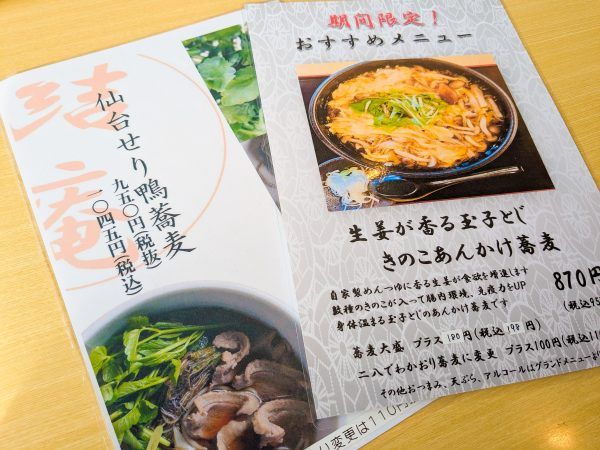 4月頃まで「仙台せり鴨蕎麦」や「生姜が香る玉子とじきのこあんかけ蕎麦」の期間限定メニューもあるそうです。 こちらの限定メニューも1,000円で嬉しすぎます。 「仙台せり蕎麦」は早めに終了するそうなので、食べたい方は訪問前に一度電話で確認してくださいね♪