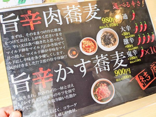 食後にテーブルを見ていると、結庵オリジナル「旨辛かす蕎麦」という変わったメニューが♪ お腹はいっぱいですが、辛いもの好きの私は旨辛と国産牛モツの文字に惹かれます(笑)