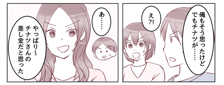 義妹のマリさんから抗議の電話がかかってきたので、義実家に集まっての家族会議が始まりました。強い口調で怒る義妹に対し、夫はポロっと「だってチナツがそう言ったから」とこぼします。私は状況をなるべく丁寧に説明します。