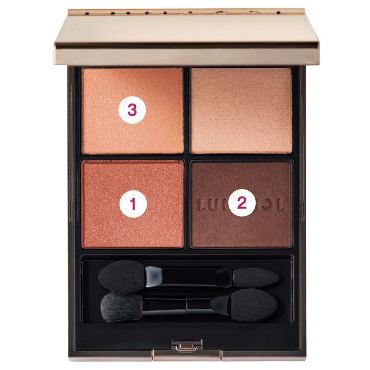 ①をアイホールに、①と②を混ぜてキワから二重幅まで塗り、筆の残りを下のまつ毛キワ全体にうっすらのせる。③をアイホールの上半分と下まぶたに広めに入れる。手持ちのアイラインでまつ毛の間を埋めて、目尻のラインは②を取った細いチップで横にぼかし、影で目幅を拡大。