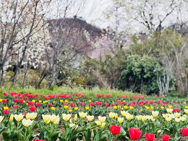 桜をバックに、チューリップとの可愛らしい組み合わせも魅力です。