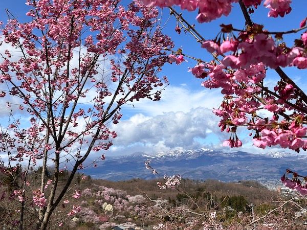 さらに進むと、花桃の間から望む吾妻山も楽しめます。