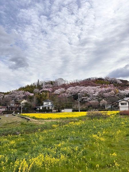 美しい桜をバックに広がる菜の花畑。