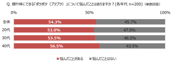 はじめに、顔や体にできる“ポツポツ” について悩んだことがあるか尋ねたところ、20代〜40代女性の約2人に1人が「悩んだことがある」と回答しました。