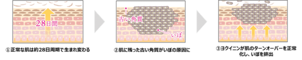 “ヨクイニン” は、ハトムギの皮をむいた種子を原料とした植物由来の生薬で、肌への栄養補給や水分代謝を促したり、排膿・抗炎症作用などがあります。長くなってしまったターンオーバー周期を正常化させることで、いぼや肌あれをからだの中から改善します。