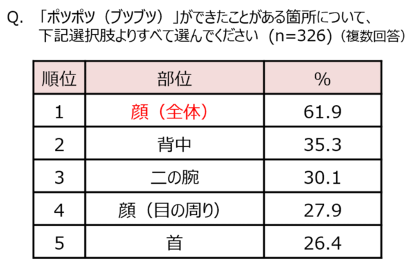 また、 “ポツポツ” について「悩んだことがある」人が回答した気になる部位については、「顔(全体)」が61.9%と圧倒的に最も多く、次いで背中、二の腕と続くことがわかりました。