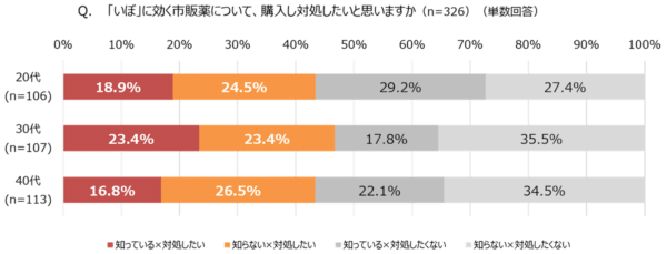 さらに、「いぼ」に効く市販の購入意向については、全世代において4割以上の人が「対処したい」と回答。特に、市販薬の存在を知らなかった層のうち、2割以上が「対処したい」と前向きな意向を示しており、一定数の人がセルフケアへの関心を持っていることが明らかになりました。