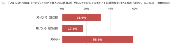 また、塗り薬の認知度(31.9%)に比べて内服薬(飲み薬)は17.2%と塗り薬の認知度のおよそ半分に留まっており、内服による「いぼ」ケアへの認知向上の余地があることがうかがえます。