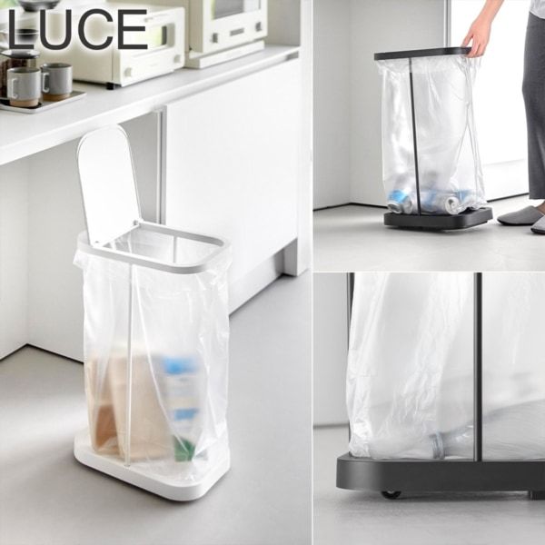 スチールフレーム・蓋・台座で構成された、シンプルなゴミ袋ホルダーです。