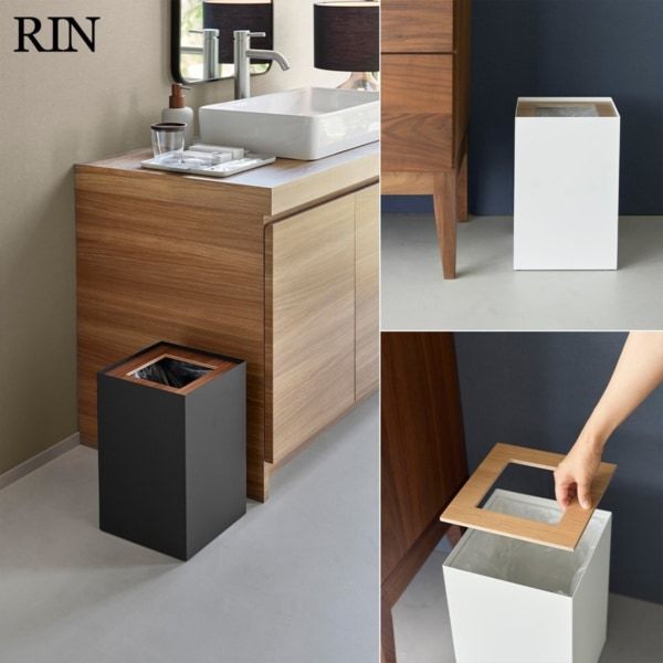 温かみのある天然木の蓋とスチールの組み合わせが美しい、スクエア型トラッシュカン。内側のストッパーリングでゴミ袋を固定でき、袋が見えず生活感を抑えられます。