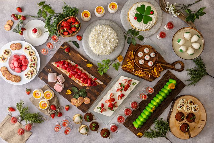 いちごパイ、ショートケーキ、いちごホワイトショコラモンブランなど20種以上のスイーツに加え、スモークサーモンといちご風味のクロワッサンサンドやシーフードのいちご風味マリネなど、豊富な食事メニューも楽しめる充実のラインナップ。
