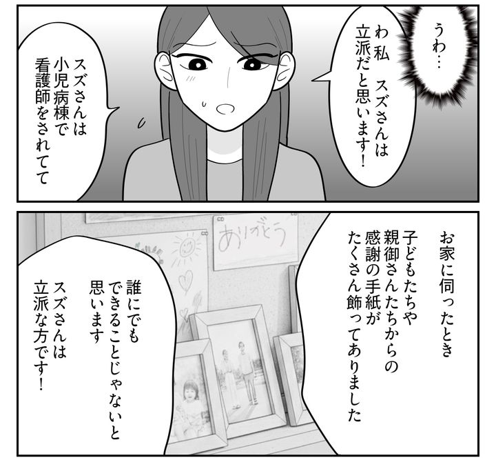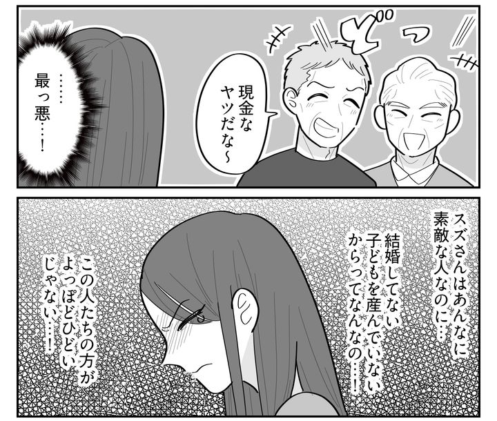 私からすると、そんなときの旦那や親族たちの顔は醜くゆがんで見えます。スズさんは誰にも迷惑をかけていないのに、どうしてそこまで言われなければいけないのでしょう? それなのに表立って反論できなかった私……。自分のことを心から情けなく思っていたのでした。