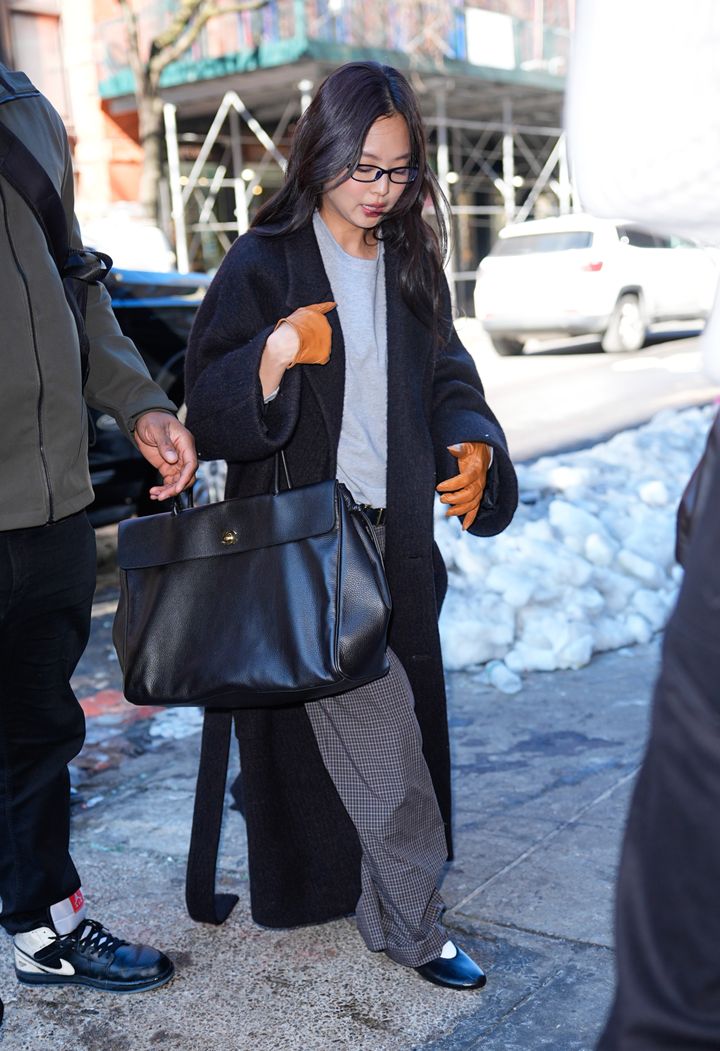 ジェニーは、グレーのチェック柄スラックスにローファーを合わせたシックな装いに、“ラージ ショッピング バッグ”を合わせて。ブラックのロングコートを重ねて落ち着いたトーンでまとめながら、奥行きのあるスタイリングに仕上げている。