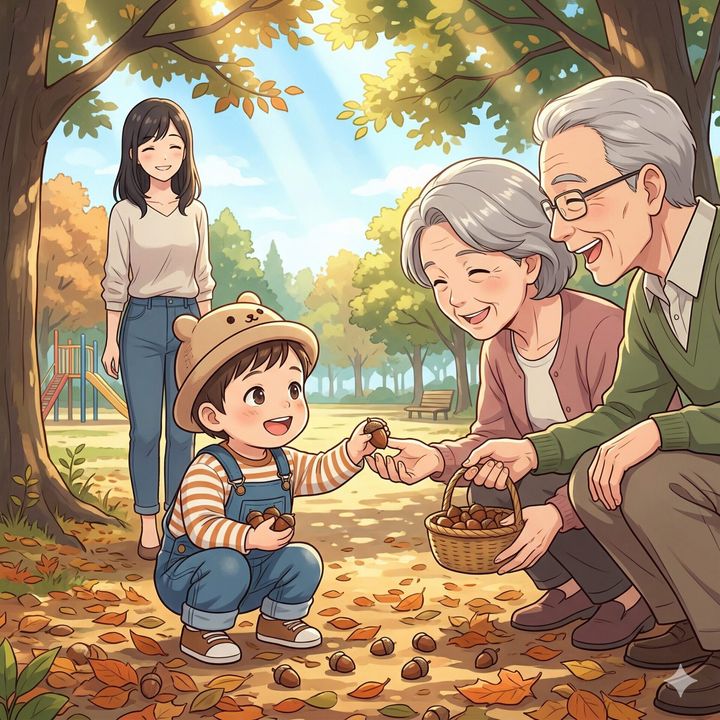 「お義父さん、お義母さん。実は最近、この子は『どんぐり拾い』にすっかりハマっているんです。もしよろしければ、すぐそこの大きな公園にみんなで行ってみませんか?」