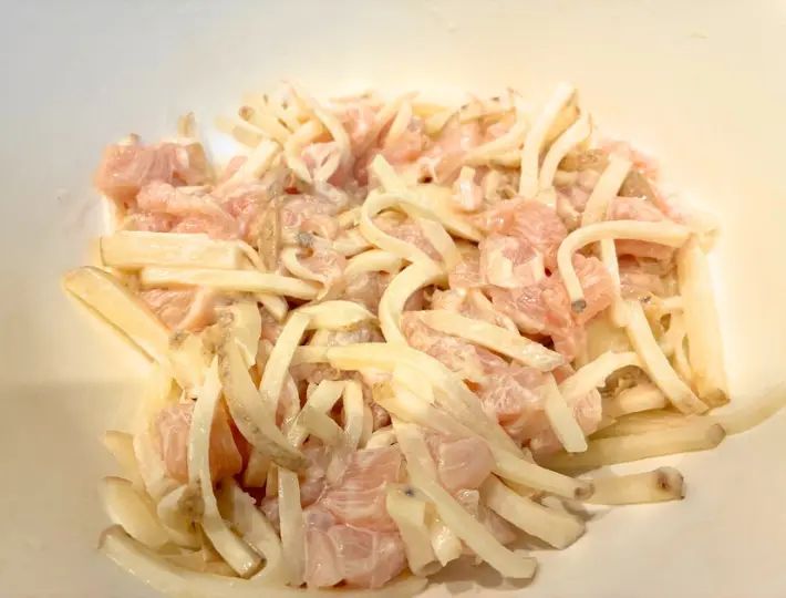 水気を切ったジャガイモをボウルに入れ、鶏むね肉、片栗粉、マヨネーズを加えて混ぜ合わせます。