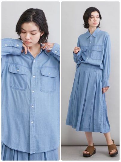 ほんのりシアーな軽いデニム生地を使ったオーバーシャツとプリーツスカート。シャツは