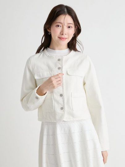 すっきりとしたノーカラーのデニムジャケット。フロントにはビジューボタンをあしらい華やかなディテールをプラス。着丈短めだから、カーディガン感覚で軽やかに羽織れます。