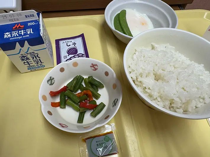 ご飯、おかず、汁物のメニューが一般的な日本の入院食を見慣れていると、かなりシンプルに見えるでしょう。